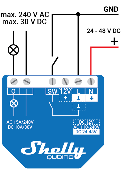 ⚠CAUTION! Use only one phase AC circuit. Do not use mixed AC and DC circuits. ⚠CAUTION! Before starting the mounting/installation of the Device, check that the breakers are turned off and there is no voltage on their terminals. This can be done with a mains voltage tester or multimeter. When you are sure that there is no voltage, you can proceed to connecting the wires. ⚠CAUTION! Do not allow children to play with the push-buttons/ switches connected to the Device. Keep the devices for remote control of Shelly Wave (mobile phones, tablets, PCs) away from children.